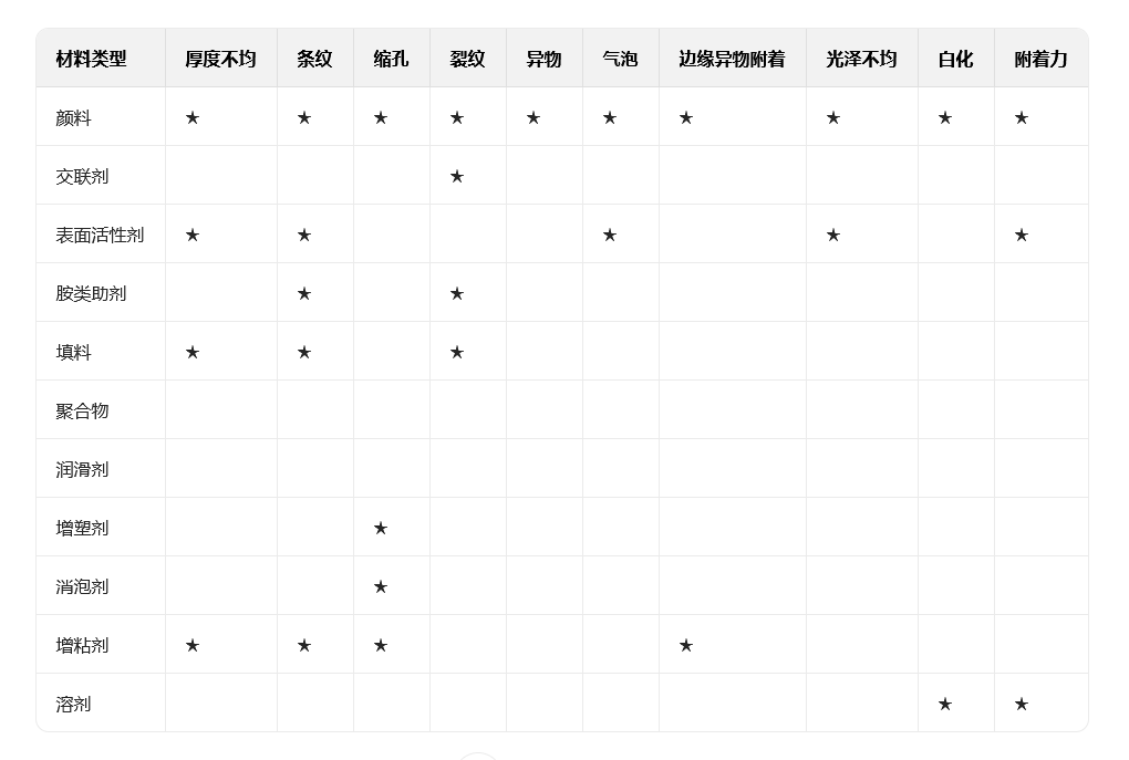 厚度不均:因黏度不適、基材帶電、馬蘭戈尼效應(yīng)等導(dǎo)致。可通過消除基材靜電、調(diào)整干燥條件、優(yōu)化供液位置等解決。